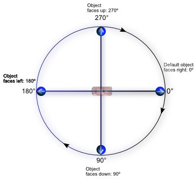 By default, the facing angle of our sprite is 0 which is the right side of our sprite, but we can change the way that our object is facing by changing the value of Angle offset. Here is an image to help you understand the coordinates in GDevelop: